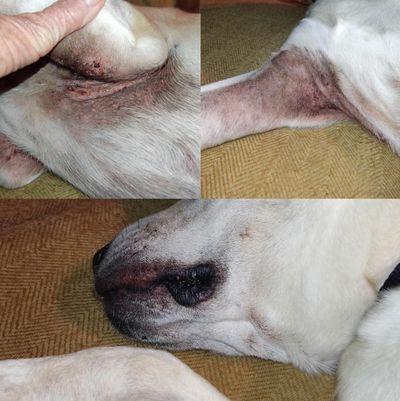At last things were starting to get back on track, until Jasper had other ideas. He and his doggy companion Sofi managed to escape their garden again and this time went missing for 28 hours! It is important to mention that at this point Jasper was not going out for walks, instead his guardian was doing daily Animal Centred Education (ACE) Freework with him. So, for him to be out on his own was extremely distressing for his guardian. Once they had been found, both Jasper and Sofi were understandably physically and mentally exhausted from their adventure and the next day Jasper’s skin had become badly inflamed and sore. This experience gave us more clues into the link between Jasper’s skin condition and confinement.